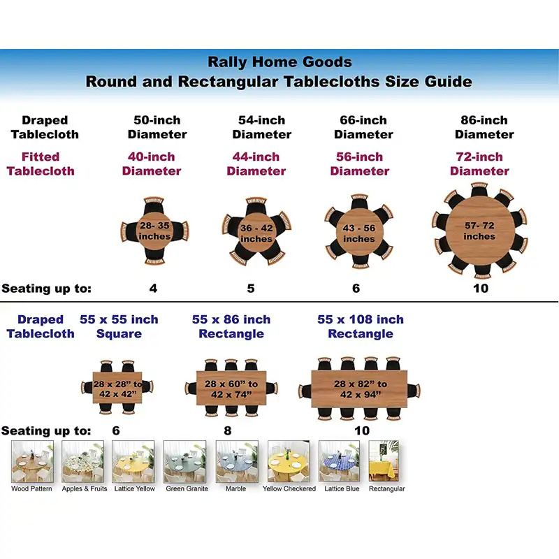 Wedding linens inc., since year 2000, has been in the wedding supply business with its own factory and mill to manufacture our inventory of very high quality table linens, table covers, chair covers, chair sashes, table runners, table overlays, table napkins, table skirts. The round tablecloth comes in following sizes, each size fits round tables of a range of diameters. Reasons to shop from us welcome to table linen direct, your source for factory direct table linens at wholesale prices. Get ready for a special occasion or add some class to everyday meals by using this fitted vinyl tablecloth in your dining area.